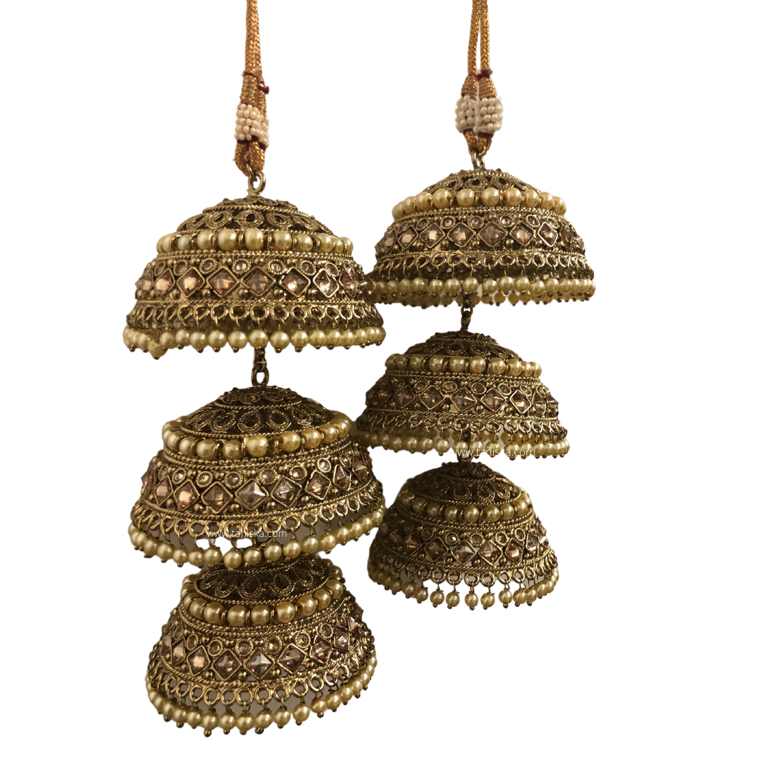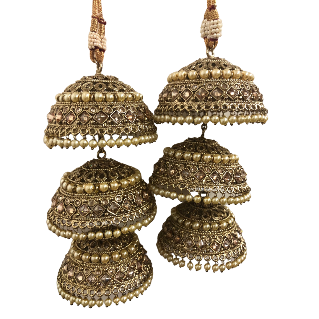 Pair of antique gold 3 jhumki layered Indian bridal kaleerey.